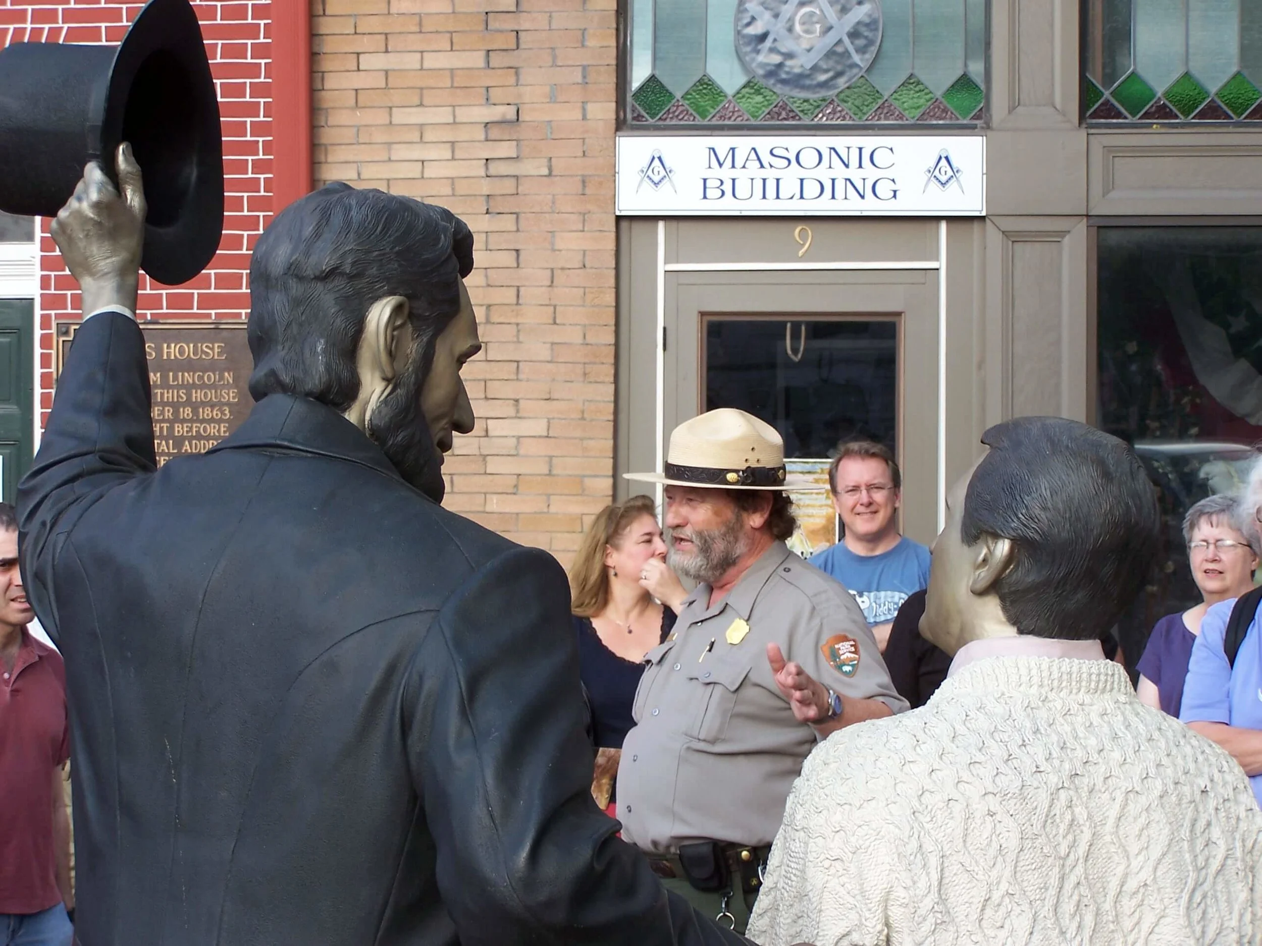 A National Park Service Park Ranger in front of the David Wills House